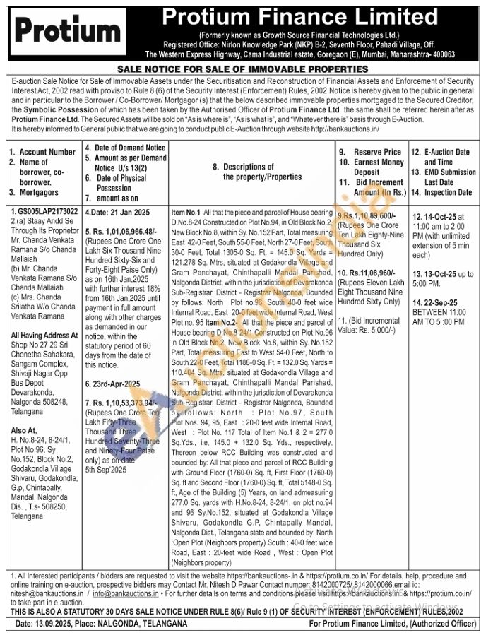 Item No.1 All that the piece and parcel of House bearing D.No.8-24 Constructed on Plot No.94, in Old Block No.2. New Block No.8, within Sy. No. 152 Part, Total measuring East 42-0 Feet, South 55-0 Feet, North 27-0 Feet, South 30-0 Feet, Total 1305-0 Sq. Ft. 145.0 Sq. Yards 121.278 Sq. Mirs, situated at Godakondla Village and Gram Panchayat, Chinthapalli Mandal Parishad, Nalgonda District, within the jurisdiction of Devarakonda Sub-Registrar, District - Registrar Nalgonda, Bounded by follows: North Plot no.96, South 40-0 feet wide Internal Road, East 20-0 feet wide Internal Road, West Plot no. 95 Item No.2- All that the piece and parcel of House bearing D.No.8-24/1 Constructed on Plot No.96 in Old Block No.2, New Block No.8, within Sy. No.152 Part, Total measuring East to West 54-0 Feet, North to South 22-0 Feet, Total 1188-0 Sq. Ft. 132.0 Sq. Yards = 110.404 Sq. Mtrs, situated at Godakondla Village and Gram Panchayat, Chinthapalli Mandal Parishad, Nalgonda District, within the jurisdiction of Devarakonda Sub-Registrar, District Registrar Nalgonda, Bounded by follows: North Plot No.97, South Plot Nos. 94, 95, East 20-0 feet wide Internal Road, West Plot No. 117 Total of Item No.1 & 2 277.0 Sq. Yds., ie, 145.0 132.0 Sq. Yds., respectively, Thereon below RCC Building was constructed and bounded by: All that piece and parcel of RCC Building with Ground Floor (1760-0) Sq. ft, First Floor (1760-0) Sq. ft and Second Floor (1760-0) Sq. ft. Total 5148-0 Sq. ft, Age of the Building (5) Years, on land admeasuring 277.0 Sq. yards with H.No.8-24, 8-24/1, on plot no.94 and 96 Sy.No. 152, situated at Godakondla Village Shivaru, Godakondla G.P. Chintapally Mandal, Nalgonda Dist., Telangana state and bounded by: North Open Plot (Neighbors property) South: 40-0 feet wide Road, East: 20-feet wide Road, West Open Plot (Neighbors property)