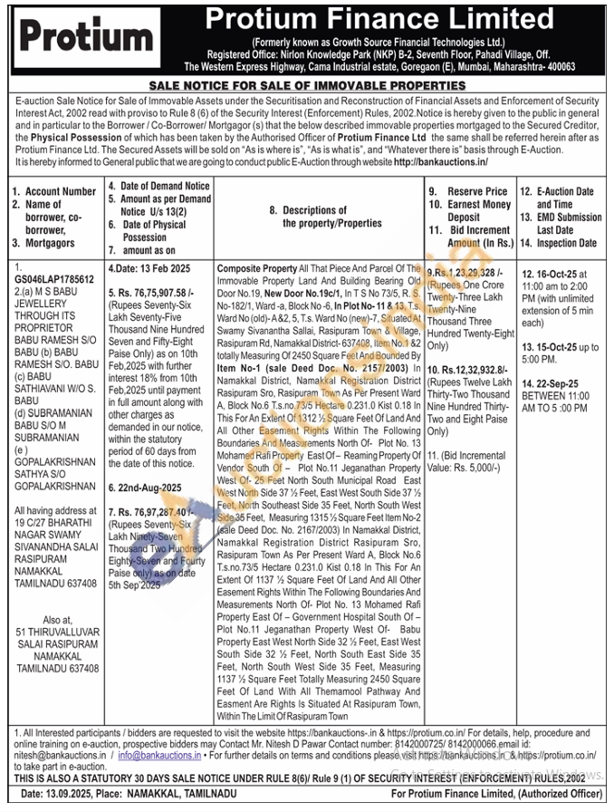 Composite Property All That Piece And Parcel Of The Immovable Property Land And Building Bearing Old Door No.19, New Door No.19c/1, In T S No 73/5, R. S. No-182/1, Ward-a, Block No-6, In Plot No-11 & 13, T.s. Ward No (old)-A&2, 5, T.s. Ward No (new)-7, Situated At Swamy Sivanantha Sallai, Rasipuram Town & Village. Rasipuram Rd, Namakkal District-637408, Item No.182 totally Measuring Of 2450 Square Feet And Bounded By Item No-1 (sale Deed Doc. No. 2157/2003) in Namakkal District, Namakkal Registration District Rasipuram Sro, Rasipuram Town As Per Present Ward A. Block No.6 T.s.no.73/5 Hectare 0.231.0 Kist 0.18 In This For An Extent Of 1312% Square Feet Of Land And All Other Easement Rights Within The Following Boundaries And Measurements North Of Plot No. 13 Mohamed Rafi Property East Of Reaming Property Of Vendor South Of Plot No.11 Jeganathan Property West Of- 25 Feet North South Municipal Road East West North Side 37% Feet, East West South Side 37% Feet, North Southeast Side 35 Feet, North South West Side 35 Feet, Measuring 1315½ Square Feet Item No-2 (sale Deed Doc. No. 2167/2003) In Namakkal District, Namakkal Registration District Rasipuram Sro, Rasipuram Town As Per Present Ward A, Block No.6 T.s.no.73/5 Hectare 0.231.0 Kist 0.18 In This For An Extent Of 1137 Square Feet Of Land And All Other Easement Rights Within The Following Boundaries And Measurements North Of Plot No. 13 Mohamed Rafi Property East Of Government Hospital South Of -Plot No.11 Jeganathan Property West Of Babu Property East West North Side 32% Feet, East West South Side 32% Feet, North South East Side 35 Feet, North South West Side 35 Feet, Measuring 1137% Square Feet Totally Measuring 2450 Square Feet Of Land With All Themamool Pathway And Easment Are Rights Is Situated At Rasipuram Town, Within The Limit Of Rasipuram Town