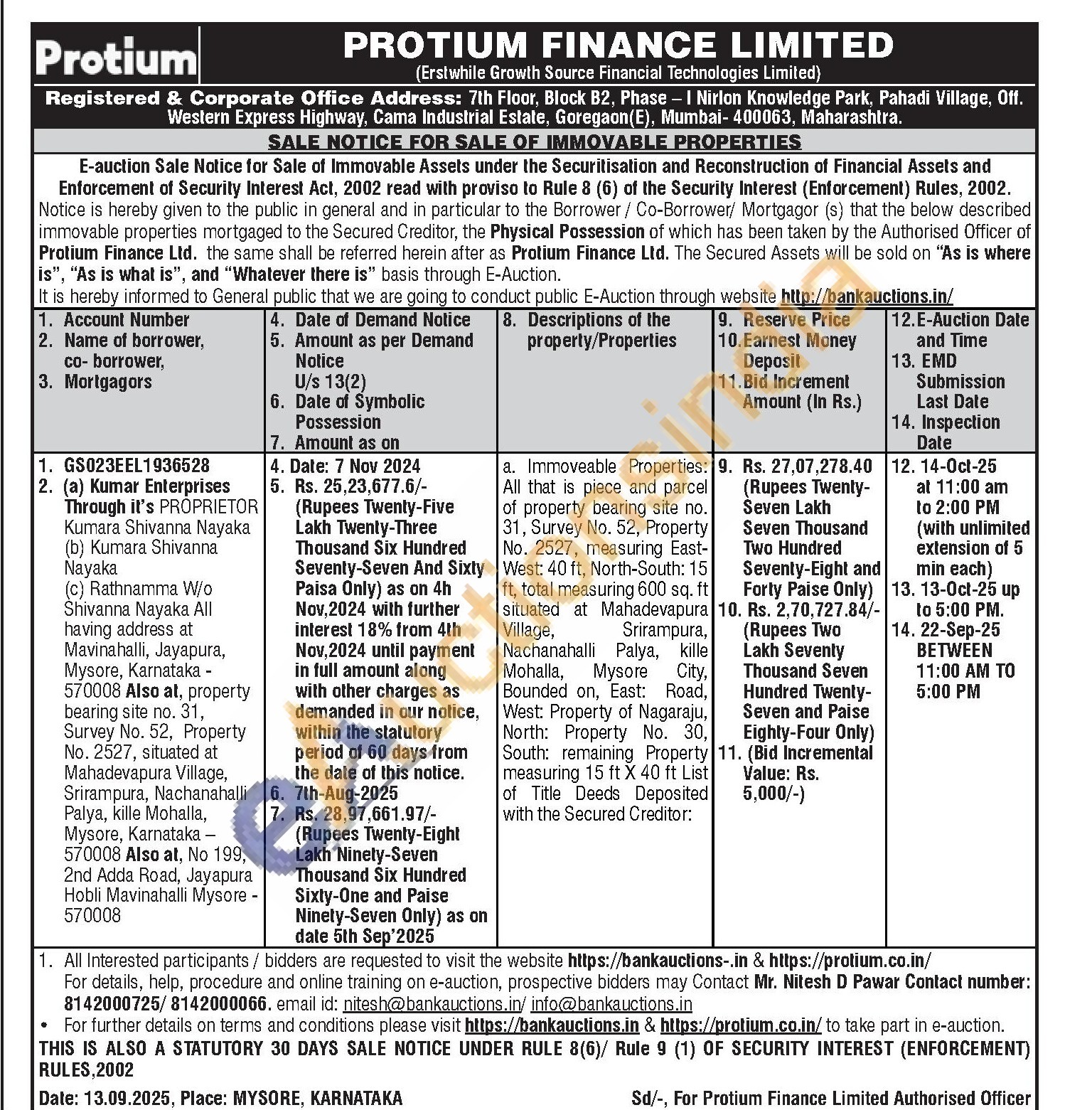 a. Immoveable Properties: All that is piece and parcel of property bearing site no. 31, Survey No. 52, Property No. 2527, measuring East-West: 40 ft, North-South: 15 ft, total measuring 600 sq. ft situated at Mahadevapura Village, Srirampura, Nachanahalli Palya, kille Mohalla, Mysore City, Bounded on, East: Road, West: Property of Nagaraju, North: Property No. 30, South: remaining Property measuring 15 ft X 40 ft List of Title Deeds Deposited with the Secured Creditor: