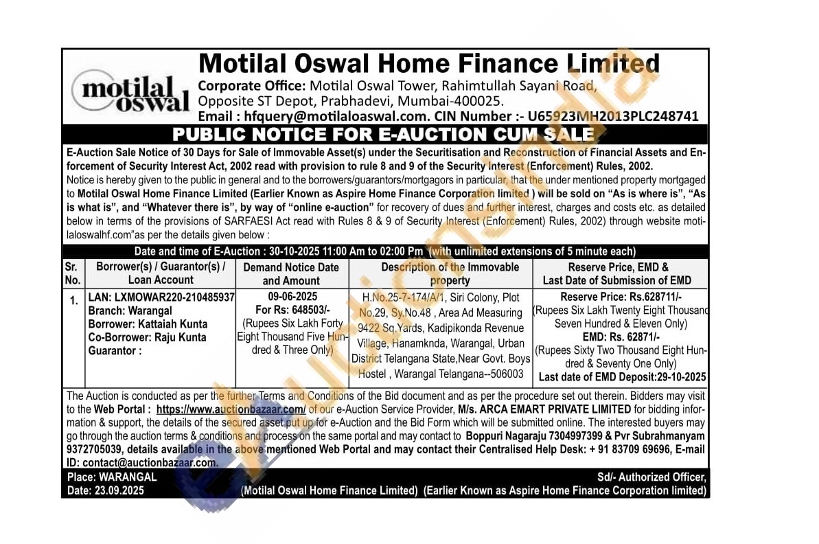 H.No.25-7-174/A/1, Siri Colony, Plot No.29, Sy.No.48, Area Ad Measuring 9422 Sq. Yards, Kadipikonda Revenue Village, Hanamknda, Warangal, Urban District Telangana State, Near Govt. Boys Hostel, Warangal Telangana-506003