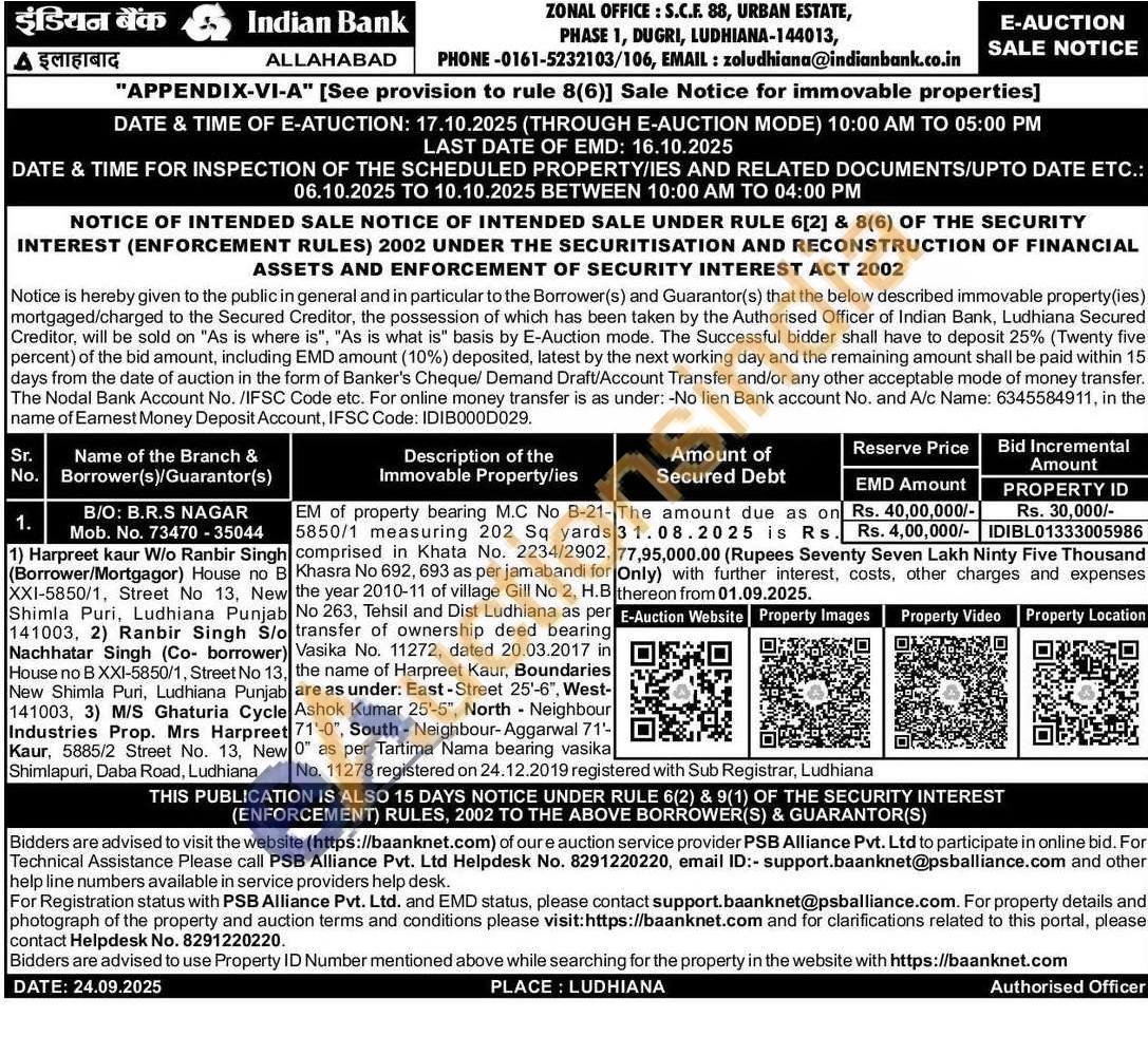 EM of property bearing M.C No B-21- 5850/1 measuring 202 Sq yards comprised in Khata No. 2234/2902, Khasra No 692, 693 as per jamabandi for the year 2010-11 of village Gill No 2, H.B No 263, Tehsil and Dist Ludhiana as per transfer of ownership deed bearing Vasika No. 11272, dated 20.03.2017 in the name of Harpreet Kaur, Boundaries are as under: East-Street 25'-6", West-Ashok Kumar 25'-5", North Neighbour 71'-0", South - Neighbour-Aggarwal 71'-0" as per Tartima Nama bearing vasika No. 11278 registered on 24.12.2019 registered with Sub Registrar, Ludhiana