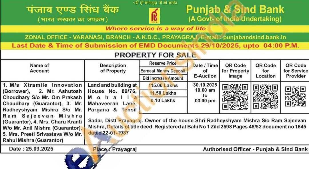 Land and building at House No. 89/76, M ohalla Mahaveeran Lane, Pargana & Tehsil Sadar, Distt Prayagraj. Owner of the house Shri Radheyshyam Mishra S/o Ram Sajeevan Mishra, Details of title deed Registered at Bahi No 1 Zild 2598 Pages 46/52 document no 1645 dated 22-01-1987