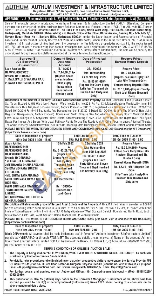 All That Residential Land Of About 1155.2 Sq. Yards Situated At:Old Ward No.4, Present Ward No.20, B.s. No.228, Rs No. 13-1, Tadepalligudem Municipality, Near Sri Venkateswara Rice Mill, West Godavari District, Andhra Pradesh-534101 (Registered Vide Document Number: 3126/2016 Dated 19/12/2016 For 544.6 Sq. Yards, And Docuent Number 3127/2016 Dated 19/12/2016, Both At The Office Of Hon. Joint Registrar, Ganapavaram, Andhra Pradesh). Boundaries: North: Others's Site And Aluminium Factory South: Municipal Road East: House Belongs To S. Satyavathi West: Others' Siteadmeasuring 1155.2.00 Sq. Yards Of Site And Rights Over The Layout Roads For Ingress And Egress With Usual Pathway Rights To Use The Roads And All Other Appurtenances Attached Thereto. The Above Property Is Situated Within The Limits Of Tadepalligudem Municipality, West Godavari District, Andhra Pradesh State PLEASE REFER THE WEBSITE FOR DETAILED TERMS AND CONDITIONS (Use Code: 206128 and see the NIT Document)