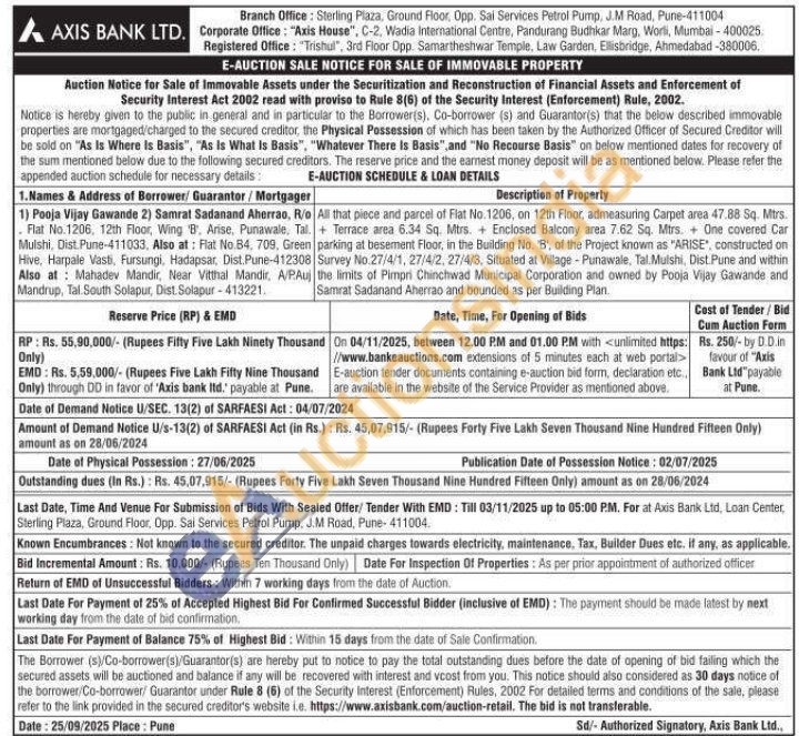 All that piece and parcel of Flat No.1206, on 12th Floor, admeasuring Carpet area 47.88 Sq. Mtrs. + Terrace area 6.34 Sq. Mtrs. Enclosed Balcony area 7.62 Sq. Mtrs. One covered Car parking at besement Floor, in the Building No. B', of the Project known as "ARISE", constructed on Survey No.27/4/1, 27/4/2, 27/4/3, Situated at Village - Punawale, Tal Mulshi, Dist Pune and within the limits of Pimpri Chinchwad Municipal Corporation and owned by Pooja Vijay Gawande and Samrat Sadanand Aherrao and bounded as per Building Plan