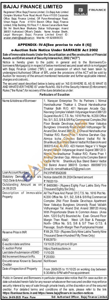All The Piece And Parcel Of C.T.S. No. 1616 Plot No. K/200 Office No. S/1, S/2, S/8 & S/9 Raj Commercial Complex 2Nd Floor Beside Devchaya Apartment Near Vatsalya Bunglows University Road Vallabh Vidhyanagar Tal. Anand Dist. Anand 388120 Along With Proportionate Share In Common Areas (Area Adm. 1220 Sq.Ft) Bounded As: East- Ground Floor Margin Then Road: West Lift Stair & Passage; North- Office No. S/3, S/6 & S/7 Then O.T.S. & Passage; South-Margin Then Pushpkamal Hostel