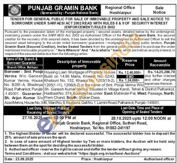 Housing Loan: Mortgage of Property: House Build on 14.86 Marla, Khewat No. 52/42,Khatouni No. 152, Khasra No. 1203(19-2),1205(1-11), 1206(6-2) in the name of Smt. Pooja Verma W/o Sh. Ganesh Kumar Verma, Situated in Village Karoli, Tehsil & District Pathankot, HadbastNo. 374. Bounded as under: East Mahinder Pal, West: Passage, North: S/o Prem Chand, South: Sharan Dass