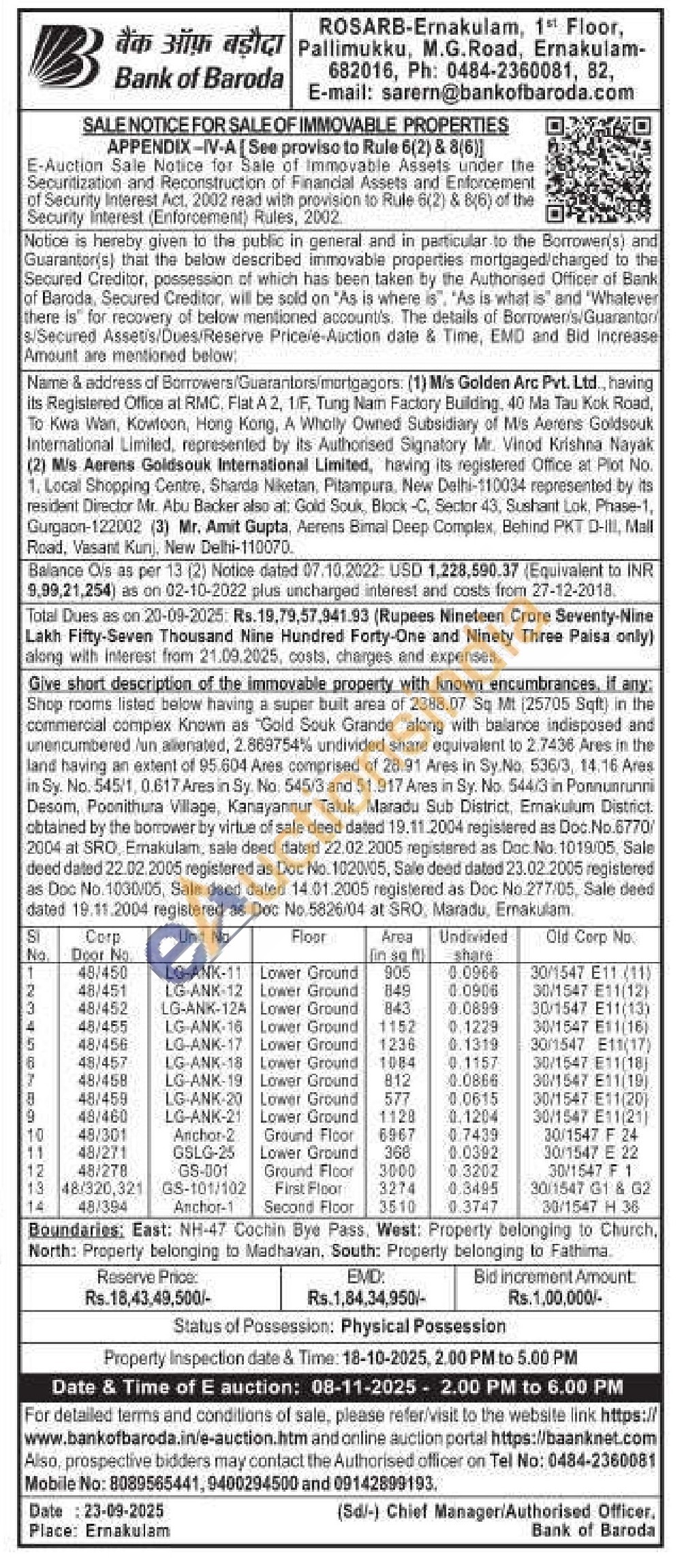 Give short description of the immovable property with known encumbrances, if any: Shop rooms listed below having a super buit area of 2388.07 Sq Mt (25705 Sqft) in the commercial complex Known as "Gold Souk Grande "along with balance indisposed and unencumbered /un allenated, 2.869754% undivided share equivalent to 2.7436 Ares in the land having an extent of 95.604 Ares comprised of 28.91 Ares in Sy.No. 536/3, 14.16 Ares in Sy. No. 545/1, 0.617 Ares in Sy. No: 545/3 and 51.917 Ares in Sy. No. 544/3 in Ponnunrunni Desom, Poonithura Village, Kanayannur Taluk, Maradu Sub District, Emakulum District. obtained by the borrower by virtue of sale deed dated 19.11.2004 registered as Doc. No.6770/2004 at SRO, Emakulam, sale deed dated 22.02.2005 registered as Doc No. 1019/05, Sale deed dated 22.02.2005 registered as Doc No. 1020/05, Sale deed dated 23.02.2005 registered as Doc No.1030/05, Sale deed dated 14.01.2005 registered as Doc No 277/05, Sale deed dated 19.11.2004 registered as Doc No.5826/04 at SRO, Maradu, Emakulam