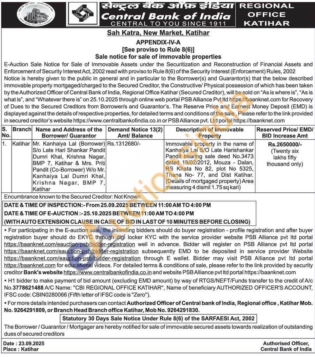 Immovable property in the name of Kanhaiya Lal S/O Late Harishankar Pandit bearing sale deed No.3473 dated 18/02/2012, Mouza- Dalan, RS Khata No 82, plot No 5325, Thana No-77, and Dist Katihar. (Details of mortgaged property) Area measuring 4 dismil 1.75 sq kari)