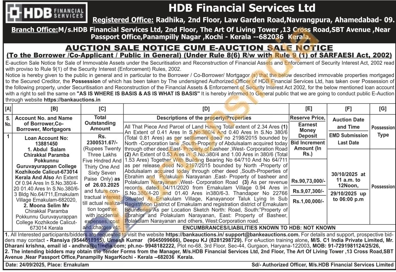 All That Piece And Parcel of Land Having Total extent of 2.34 Ares (1) An Extent of 0.41 Ares In S.No.380/4 And 0.40 Ares In S.No 380/6 (Total 0.81 Ares) as per settlement deed no 2198/2015 bounded by North-Corporation lane, South-Property of Abdulsalam acquired today through other deed, East- Property of basheer West- Corporation Road (2) An Extent of 0.53 Ares in S.No.380/4 and 1.00 Ares in 380/6 (Total 1.53 Ares) Together With Building Bearing No 64/710 And No 64/711 as per release deed No 2197/2015 bounded by North Property of Abdulsalam acquired today through other deed, South-Properties of Ebrahim and Polakulam Narayanan, East- Property of basheer and Polakulam Narayanan, West- Corporation Road (3) As per revenue records dated 04/11/2020 from Ernakulam Village 0.94 Ares in S.No.380/4-20 and 01.40 Ares in380/6-3. Thandaper No 22766 Situated At Ernakulam Village, Kanayanoor Taluk Lying In Sub Registration District of Emakulam and registration district of Ernakulam Bounderies As per Location Sketch North: Road, South: "Property of Ebrahim and Polakulam Narayanan, East: Property of Basheer, Polakulam Narayanan and others, West: Corporation road