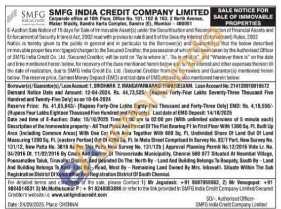 All That Piece And Parcel Of The Flat Bearing F1 In First Floor With 1300 Sq. Ft. Built Up Area (including Common Areas] With One Car Park Area Together With 600 Sq. Ft. Undivided Share Of Land Out Of Land Measuring 1200 Sq. Ft. [eastern Portion) Out Of 4360 Sq. Ft. In Metu Street Comprised in Survey No. 82/7 Part, New Survey No. 131/12, New Patta No. 3819 As Per This Patta New Survey No. 131/12b | Approval Planning Permit No. 12/2016 Vide Lr. No. 34/2016 DI. 11/02/2016 By Cmda And Commr Of Thiruverkade Municipality, Chennai 600 077 Situated At Noombal Village, Poonamallee Taluk, Tiruvallur District, And Bounded On The: North By-Land And Building Belongs To Boopaty, South By-Land And Building Belongs To Kasi, East By-Road, West By-Remaining Land Owned By Mrs. Inbavalli. Situate Within The Sub Registration District Of Kundrathur And Registration District Of South Chennai