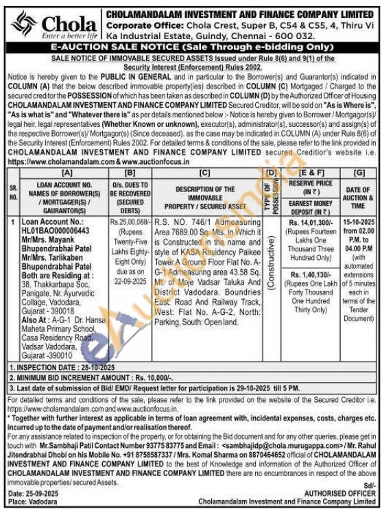 R.S. NO. 746/1 Admeasuring Area 7689.00 Sq. Mts. In Which it is Constructed in the name and style of KASA Residency Paikee Tower A Ground Floor Flat No. A-G-1 Admeasuring area 43.58 Sq. Mt. of Moje Vadsar Taluka And District Vadodara. Boundries East: Road And Railway Track, West: Flat No. A-G-2, North: Parking, South: Open land.