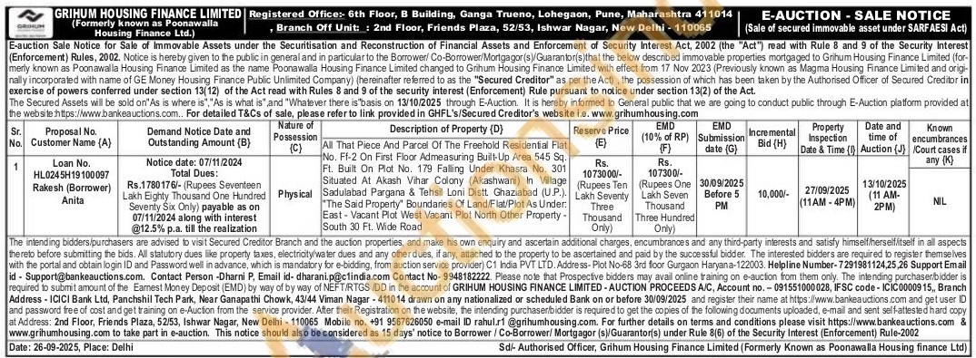 All That Piece And Parcel Of The Freehold Residential Flat No. Ff-2 On First Floor Admeasuring Built-Up Area 545 Sq. Ft. Built On Plot No. 179 Falling Under Khasra No. 301 Situated At Akash Vihar Colony (Akashwani) In Village "The Said Property Boundaries Of Land/Fiat/Plot As Under: East-Vacant Plot West Vacant Plot North Other Property-South 30 Ft. Wide Road Sadulabad Pargana & Tehsil Loni Distt. Ghaziabad (U.P.).