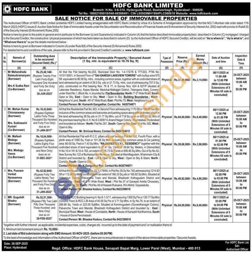 All that the RCC Building bearing H. No:6-1-3/11, admeasuring 1300 Sq Fts or 120.77 Sq Mtrs (Ground Floor) & RCC L/B Area of 40.00 Sq Fts or 3.71 Sq Mtrs, in Sy No. 76, to an extent of 266.66 Sq. Yards or 223.00 SqMtrs, Situated at Kommugudem (Govardhanagiri Colony). Palvancha Town and Mandal, Bhadradri Kothagudem District and bounded by: East: Municipal Road, West: House of Conistable, North: House of Kampelli Kanthamma, South House of Gorre Penchalaiah.