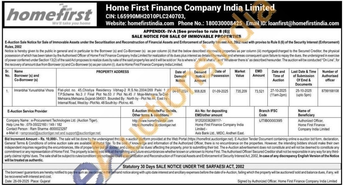 Flat-plot no. 45. Chistiya Residency Vibhag-2 R.S.No.2004/269 Paiki 1 //T.P.Scheme No.3 // Final Plot No.53 // Plot No.45 // Moje-Mehsana, Ta-Dist-Mehsana, Mehsana, Gujarat-384001. Bounded By: North by-Plot No.44. East by-Internal Road, Westby-Plot No. 48 South by-Plot no. 46.