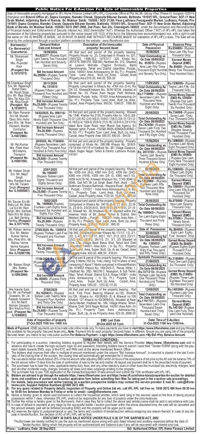 5) All that part and parcel of the property bearing: Khasra No. 4359 min (8-0), 4360 min (2-0), 4359 min (240), 4360 min (1916), 4359 min (24-0), 4360 min(1-10), 4359 min (19-16), Khewat/ Khatauni No. 1745/9046 to 9048, Gali NO 39 Lal Singh Basti Patti Jhutti Opp Sukhmani Encalve Bathinda - Nauana Road-Bathinda Punjab-151001-India Area Admeasuring (In Sq. Ft.): Property Type: Land Area, Built Up Area, Carpet Area Property Area: 1125.00, 1020.00, 867.00