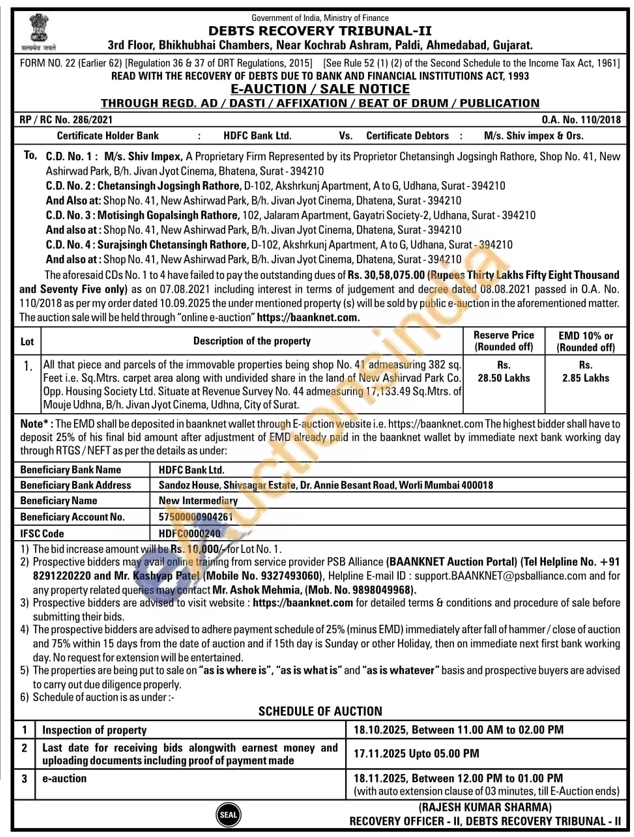 All that piece and parcels of the immovable properties being shop No. 41 admeasuring 382 sq. Feet i.e. Sq.Mtrs. carpet area along with undivided share in the land of New Ashirvad Park Co. Opp. Housing Society Ltd. Situate at Revenue Survey No. 44 admeasuring 17,133.49 Sq.Mtrs. of Mouje Udhna, B/h. Jivan Jyot Cinema, Udhna, City of Surat.