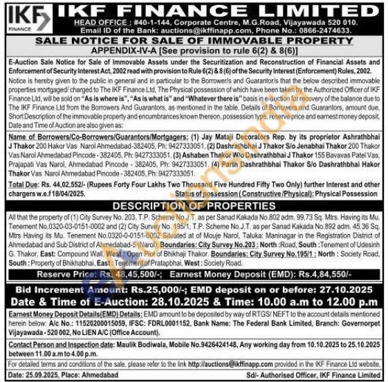 All that the property of (1) City Survey No. 203, T.P. Scheme No.J. T. as per Sanad Kakada No.802 adm. 99,73 Sq. Mtrs. Having its Mu. Tenement No.0320-03-0151-0002 and (2) City Survey No. 195/1, T.P. Scheme No.J.T. as per Sanad Kakada No 892 adm. 45.36 Sq. Mtrs Having its Mu. Tenement No. 0320-0-0151-0002 Situated at of Mouje Narol, Taluka: Maninagar in the Registration District of Ahmedabad and Sub District of Ahmedabad-5 (Narol), Boundaries: City Survey No.203: North Road, South: Tenement of Udesinh G. Thakor, East: Compound Wall, West: Open Plot of Bhikhaji Thakor Boundaries: City Survey No.195/1: North: Society Road, South: Property of Bhikhabhai, East: Tenement of Pratapbhai, West: Society Road.