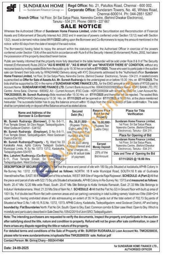 DESCRIPTION OF SECURED PROPERTY: All that the piece and parcel of site with 180 Sq.ydis Situated at kadakatla, APHB Colony in Re-Survey No: 137/2 137/3 and measured as follows: NORTH: 18 it wide Municipal Road, SOUTH:18 ft site of Gudivada Veerabhadra Rao, EAST: 90 ft Second part of this schedule, WEST: 90ft Site of Vegunta Raja Rajeswari. SCHEDULE-A(Part-2) All that the piece and parcel of site with 522.73 Sq, yds Situated at kadakatla, APHB Colony in Re-Survey No: 137/3 and measured as follows: North: 20.47 Mts 12.20 Mts wide Road, South: 20.47 Mits Site Belongs to Kotla Venkata Ramaiah, East: 21.33 Mts Site Belongs to Indukuri Venkataramana, West: 21.33 Mts Site of Item No. 1. SCHEDULE-BAll that the Flat No. G3 in Ground floor with built up area of 1001 Sq. ft of double bed Room flat (with common areas and car parking) consisting in total building namely Vaishnavi Elite (Still+G+4 upper floors), having undivided share of site admeasuring an extent of 35.14 Sq.yards out of the total extent of 702.73 Sq yards of Situated at Near D.No.1-48-10, R.S.No. 137/2, 137/3, APHB Colony, Kadakatla, Tadepalligudem, west Godavan District, AP and being bounded by: Flat Boundaries North: Flat No.G4, South: Open to Sky, East: Common comdor & Staircase West: Open to Sky. Which is morellully and particularly described in Sale Deed No. 10542/2019 of Joint SRO, Tadepaligudem.