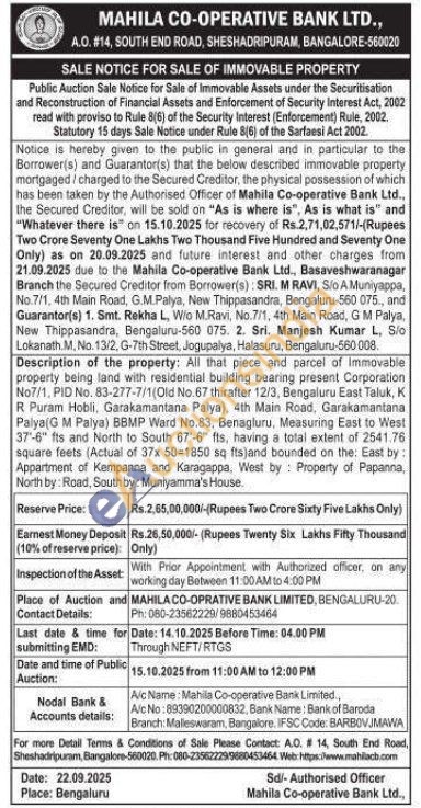 All that piece and parcel of Immovable property being land with residential building bearing present Corporation No7/1, PID No. 83-277-7/1 (Old No.67 thirafter 12/3, Bengaluru East Taluk, K R Puram Hobli, Garakamantana Palya), 4th Main Road, Garakamantana Palya(G M Palya) BBMP Ward No.83, Benagluru, Measuring East to West 37-6" fts and North to South 67-6" fts, having a total extent of 2541.76 square feets (Actual of 37x 50-1850 sq fts and bounded on the: East by: Appartment of Kempanna and Karagappa, West by Property of Papanna, North by: Road, South by: Muniyamma's House