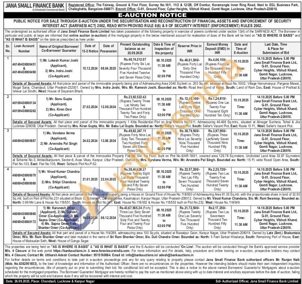 Details of Secured Assets: All that piece and parcel of the immovable property being plot of Admeasuring Area 2040 Sq.feet i.e. 203 Sq.mtr, situated at Arazi No. 100/2, Village Hanumanpur, Pargana Mawai, Mugal Sarai, Chandauli, Uttar Pradesh-232001. Owned by Mrs. Indra Joshi, W/o. Mr. Ramesh Joshi. Bounded as: North: Road then Land of Ramji, South: Land of Ram Das, East: House of Prahlad & Ishwar Lal Sindhi, West: House of Dayaram Bharti.