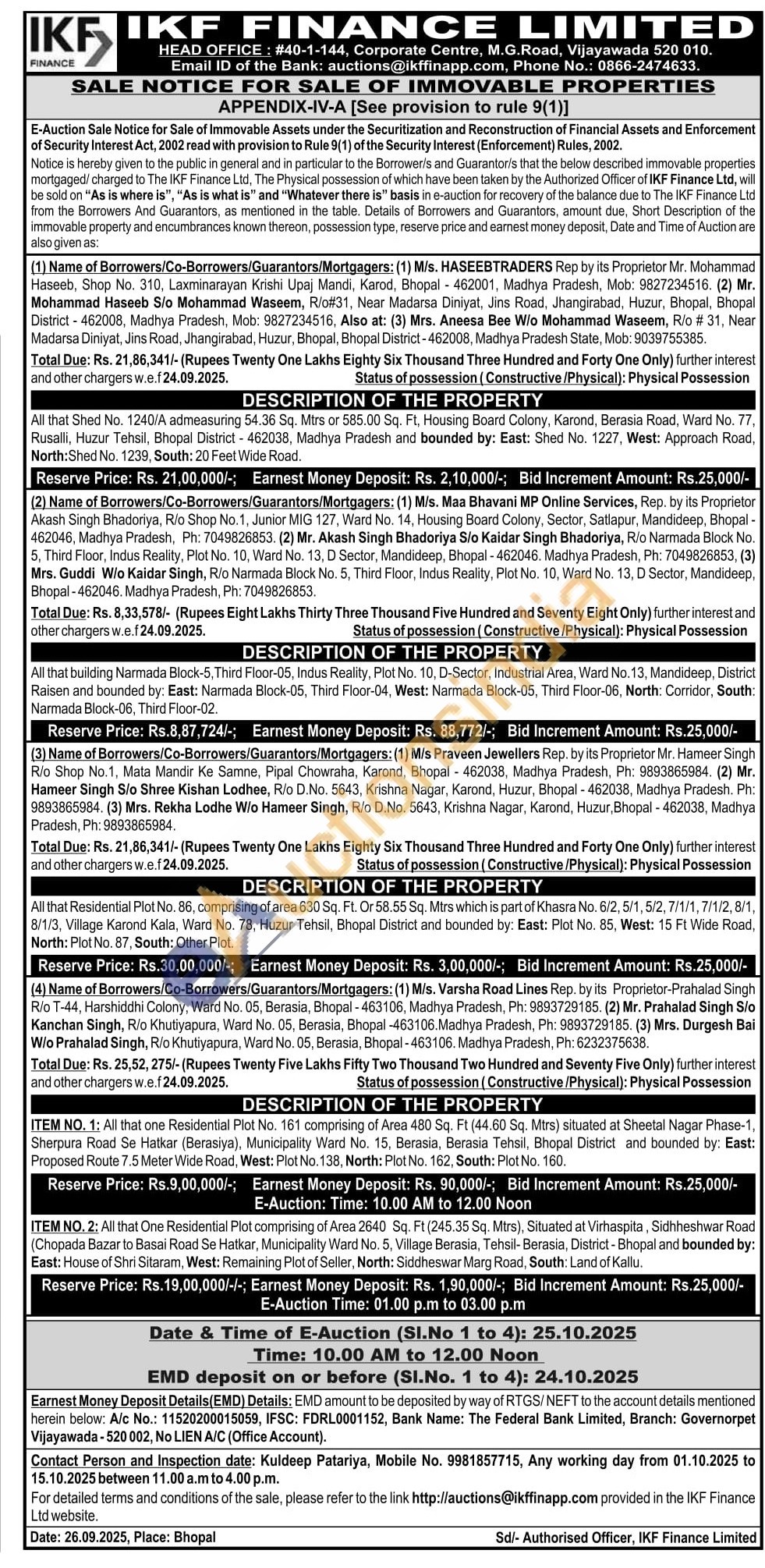 All that Shed No. 1240/A admeasuring 54.36 Sq. Mtrs or 585.00 Sq. Ft, Housing Board Colony, Karond, Berasia Road, Ward No. 77, Rusalli, Huzur Tehsil, Bhopal District - 462038, Madhya Pradesh and bounded by: East: Shed No. 1227, West: Approach Road, North: Shed No. 1239, South: 20 Feet Wide Road.