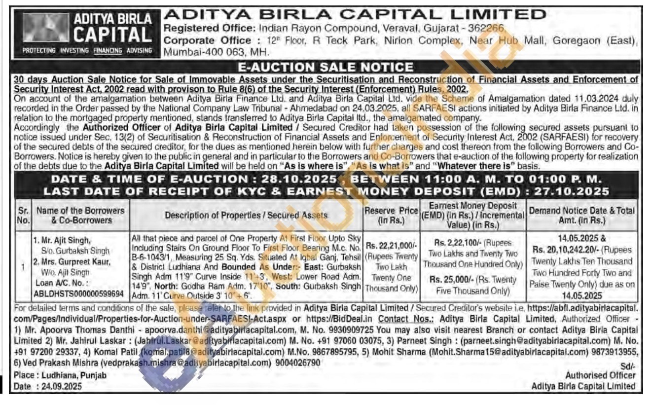 All that piece and parcel of One Property At First Floor Upto Sky Including Stairs On Ground Floor To First Floor Bearing M.c. No. B-6-1043/1, Measuring 25 Sq. Yds. Situated At Iqbal Ganj, Tehsil & District Ludhiana And Bounded As Under:- East: Gurbaksh Singh Adm 11'9" Curve Inside 11'+3', West: Lower Road Adm. 14'9", North: Godha Ram Adm. 17'10", South: Gurbaksh Singh