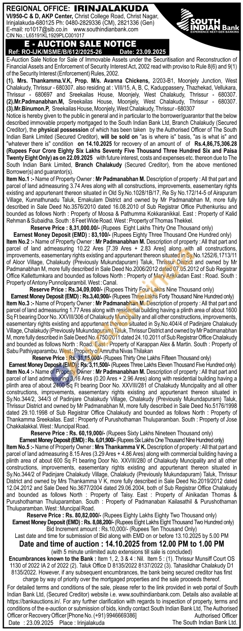 All that part and parcel of land admeasuring 3.74 Ares along with all constructions, improvements, easementary rights existing and appurtenant thereon situated in Old Sy.No. 1028/18/17, Re Sy No.172/14-5 of Airapuram Village, Kunnathunadu Taluk. Ernakulam District and owned by Mr Padmanabhan M. more fully described in Sale Deed No.3576/2010 dated 16.08.2010 of Sub Registrar Office Puthenkurisu and Registrar bounded as follows North Property of Moosa & Pathumma Kokkaranikkal. East: Property of Kalid Rehman & Subaidha. South: 8 Feet Wide Road. West: Property of Thomas Thekkel.