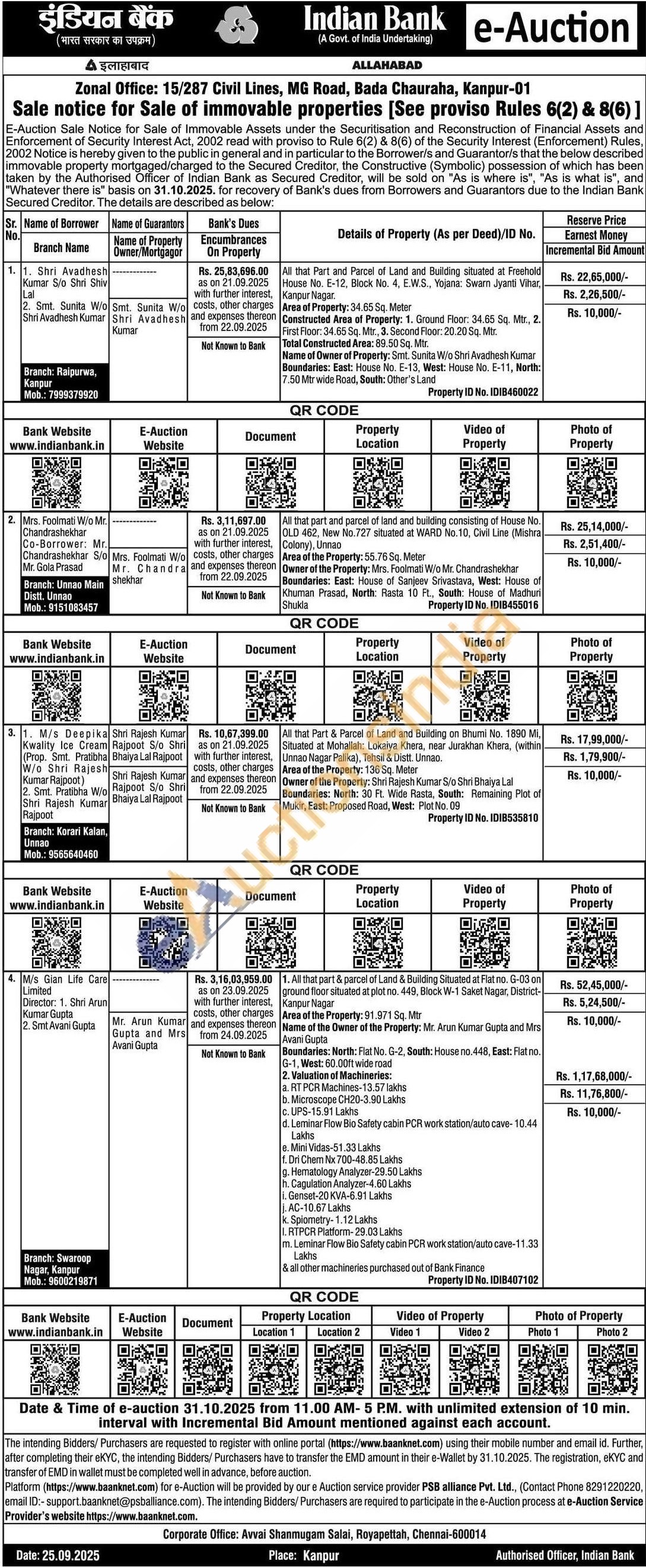 All that Part and Parcel of Land and Building situated at Freehold House No. E-12, Block No. 4, E.W.S., Yojana: Swarn Jyanti Vihar, Kanpur Nagar. Area of Property: 34.65 Sq. Meter Constructed Area of Property: 1. Ground Floor: 34.65 Sq. Mtr., 2. First Floor: 34.65 Sq. Mtr., 3. Second Floor: 20.20 Sq. Mtr. Total Constructed Area: 89.50 Sq. Mtr. Name of Owner of Property: Smt. Sunita W/o Shri Avadhesh Kumar Boundaries: East: House No. E-13, West: House No. E-11, North: 7.50 Mtr wide Road, South: Other's Land
