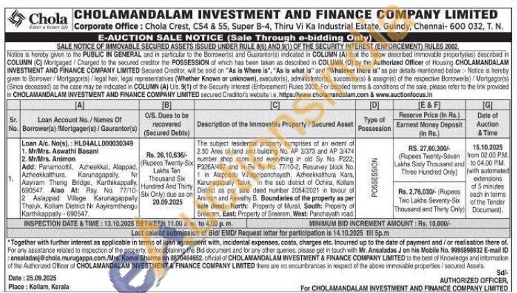 The subject residential property comprises of an extent of 2.50 Ares of land and building No. AP 3/373 and AP 3474 number shop room and everything in old Sy. No. P222, P326A/487 and in Re Sy. No. 77/10-2, Resurvey block No tin Alappadu Village/panchayath, Azheekkalthura Kara, Karunagapally Taluk, in the sub district of Ochira, Kollam District as per sale deed number 2054/2021 in favour of Animon and Aswathy B. Boundaries of the property as per sale deed: North: Property of Murali, South: Property of Sreeram, East: Property of Sreeram, West: Panchayath road
