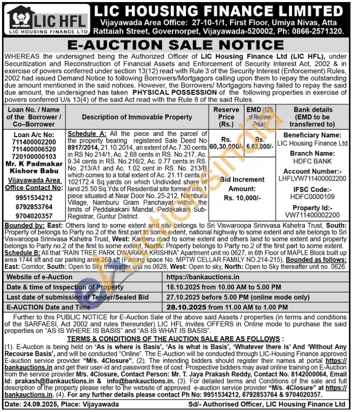 All the piece and the parcel of the property bearing registered Sale Deed No 8917/2014, 21.10.2014, an extent of Ac. 7.30 cents in RS No 214/1, Ac. 2.68 cents in RS. No.217, Ac. 9.34 cents in RS. No.216/2, Ac. 0.77 cents in RS. No. 213/A1 and Ac. 1.02 cent in RS. No. 213/B which comes to a total extent of Ac. 21.11 cents or 102172.4 Sq.yards on which Undivided share of land 25.50 Sq. Yds of Residential site formed into 1 piece situated at Near Door No. 25-212, Namburu Village, Namburu Gram Panchayat within the limits of Peddakakani Mandal, Pedakakani Sub-Registrar, Guntur District