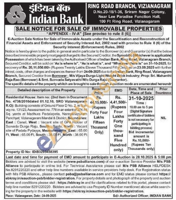 Residential House: Item no: (2nd item in Document No. 4738/2010dated 01.12.10, SRO Vizianagaram R.O): Building consists of Ground Floor D No. 2. in Sur-vey no. 131/23, Assessment no. 776 in an extent of 274.44 Sq. yards at Madhura Padalapeta, Narayanapuram Panchyat, Vizianagaram Mandal & District
