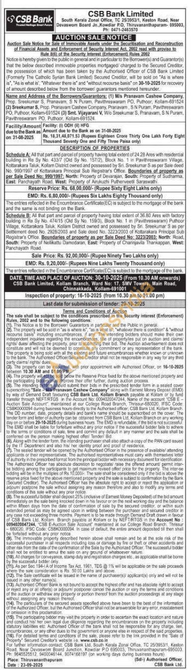 Schedule A: All that part and parcel of property having total extent of 24.28 Anes with residential building in Re Sy No. 433/7 (Old Sy No. 157/2). Block No. 1 in Pavithreswaram Village, Kottarakara Taluk, Kollam District owned and possessed by Sri. Sreekumar S as por Sale deed No. 990/1997 of Kottarakara Principal Sub Registrar's Office Boundaries of property as per Sale Deed No: 990/1997; North: Property of Devarajan, South: Property of Sudharma. East: Panchayath Road, West: Property of Airukuzhi Puthenveetil Saraswath