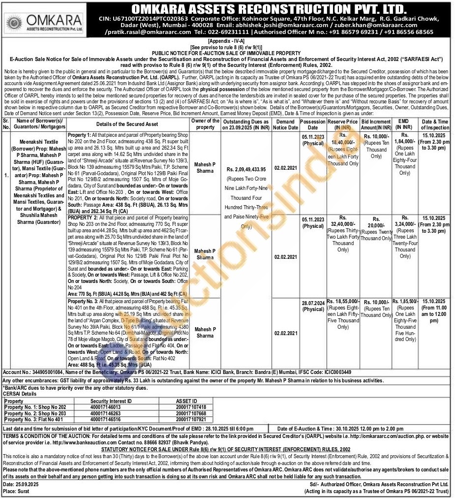 PROPERTY 2: All that piece and parcel of Property bearing Shop No 203 on the 2nd Floor, admeasuring 770 Sq. Ft super built up area and 44.28 Sq. Mirs built up area and 462 Sq Ftcar-pet area along with 25.70 Sq Mitrs undivided share in the land of Shreeji Arcade" situate at Revenue Survey No 139/3, Block No 139 admeasuring 15579 Sq Mirs Paki, TP. Scheme No 61 (Par-vat-Godadara), Original Plot No 129/B Paiki Final Plot No 129/B/2 admeasuring 1507 Sq. Mtrs of Moje Godadara, City of Surat and bounded as under: On or towards East: Parking & Society, On or towards West: Passage, Lift & Office No 202. On or towards North: Society. On or towards South: Office No 204 Area: 770 Sq. Ft (SBUA), 4428 Sq. Mtrs (BUA) and 462 Sq Ft (CA)