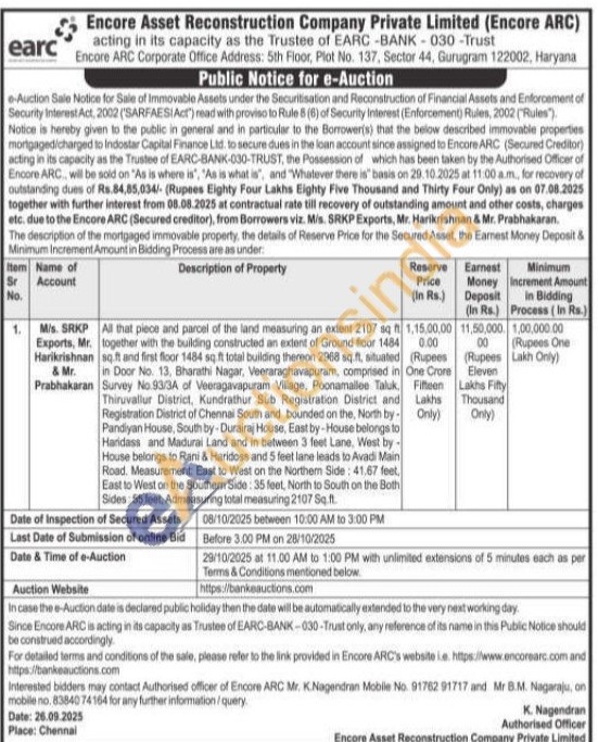 All that piece and parcel of the land measuring an extent 2107 sq ft together with the building constructed an extent of Ground floor 1484 sq.ft and first floor 1484 sq ft total building thereon 2968 sq.ft, situated in Door No. 13, Bharathi Nagar, Veeraraghavapuram, comprised in Survey No.93/3A of Veeragavapuram Village, Poonamailee Taluk, Thiruvallur District, Kundrathur Sub Registration District and Registration District of Chennai South and bounded on the, North by Pandiyan House, South by Durairaj House, East by-House belongs to Haridass and Madurai Land and in between 3 feet Lane, West by House belongs to Rani & Haridoss and 5 feet lane leads to Avadi Main Road. Measurement: East to West on the Northem Side: 41.67 feet, East to West on the Southern Side: 35 feet, North to South on the Both Sides: 55 feet, Admeasuring total measuring 2107 Sq. ft.