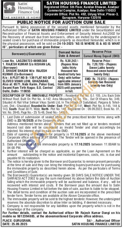 DESCRIPTION OF THE IMMOVABLE PROPERTY: Residential Flat No. G.f. 105, Lhs Back Side Without Roof, Built On Plot No. A-142, Area Measuring 38 Sq. Yds., Out Of Khasra No. 349, Situated At Rail Vihar Sehkari Vikas Samiti Ltd, In The Village Of Sadullabad, Pargana & Tehsil-Loni, Dist.- Ghaziabad. Bounded As Under: East- Plot No. A-141, West- Plot No. A-145, 144 & 143, South Road 30 Ft. Wide, North- Plot No. 149. Registered On: 09.09.2022, Book No. 01, Vol. No. 3945, Page No.- 25 To 48, Deed No.- 14350