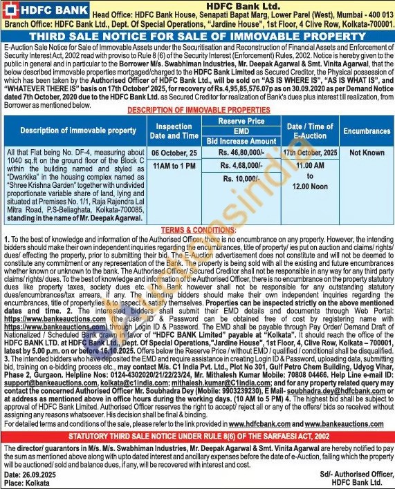 All that Flat being No. DF-4, measuring about 1040 sq.ft on the ground floor of the Block C within the building named and styled as "Dwarkika" in the housing complex named as "Shree Krishna Garden" together with undivided proportionate variable share of land, lying and situated at Premises No. 1/1, Raja Rajendra Lal Mitra Road, P.S-Beliaghata, Kolkata-700085, standing in the name of Mr. Deepak Agarwal.
