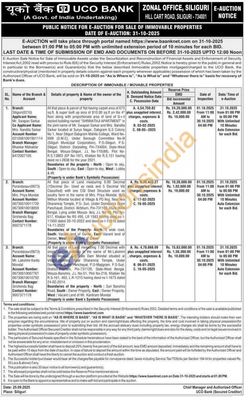 1) All that piece & parcel of flat having carpet area of 675 sq.ft. & super built up area of 810.00 sq.ft on the 4 p floor along with proportionate area of land of G+4 storied building named "SHRINATHJI APARTMENT" in the joint name of Mr. Swapan Sarkar and Mrs. Nandita Sarkar located at Surya Nagar, Dabgram G.S Colony No 1, Near Siliguri Dabgram Mahila College, Ward No-XXI (S.M.C), Under Borough Committee No-Ill (Siliguri Municipal Corporation), P.O-Siliguri, P.S-Siliguri, District Darjeeling, Pin-734004, State-West Bengal Mouza-Siliguri, J.L. No-110(88), Plot No-R.S. 13863 (EP No-197), Khatian No R.S.151 having deed no 1-2838 for the year 2021. Boundaries of the property North: Open to sky, South: Open to sky, East: Open to sky, West: Lobby