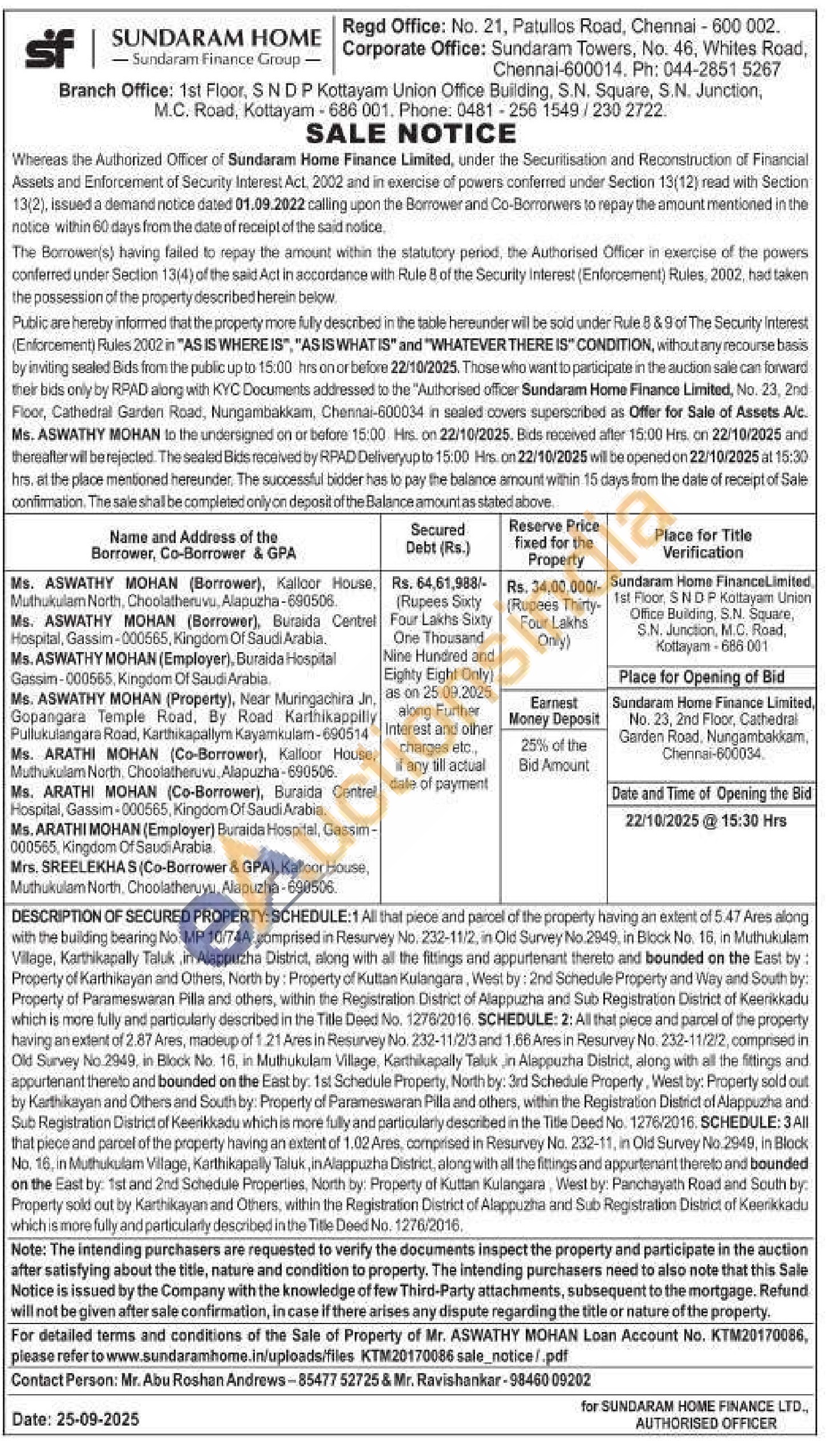 All that piece and parcel of the property having an extent of 5.47 Ares along with the building bearing No. MP 10/74A.comprised in Resurvey No. 232-11/2, in Old Survey No 2949, in Block No. 15, in Muthukulam Village, Karthikapally Taluk, in Alappuzha District, along with all the fittings and appurtenant thereto and bounded on the East by: Property of Karthikayan and Others, North by: Property of Kuttan Kulangara, West by: 2nd Schedule Property and Way and South by: Property of Parameswaran Pilla and others, within the Registration District of Alappuzha and Sub Registration District of Keerikkadu which is more fully and particularly described in the Title Deed No. 1276/2016 SCHEDULE: 2: All that plece and parcel of the property having an extent of 2.87 Ares, madeup of 1.21 Ares in Resurvey No. 232-11/2/3 and 1,66 Ares in Resurvey No. 232-11/2/2, comprised in Old Survey No 2949, in Block No. 16, in Muthukulam Village, Karthikapally Teluk in Alappuzha District, along with all the fittings and appurtenant thereto and bounded on the East by: 1st Schedule Property, North by: 3rd Schedule Property, West by: Property sold out by Karthikayan and Others and South by: Property of Parameswaran Pilla and others, within the Registration District of Alappuzha and Sub Registration District of Keerikkadu which is more fully and particularly described in the Title Deed No. 1276/2016. SCHEDULE: 3 All that piece and parcel of the property having an extent of 1.02 Ares, comprised in Resurvey No. 232-11, in Old Survey No. 2949, in Block No. 16, in Muthukulam Village, Karthikapally Taluk, in Alappuzha District, along with all the fittings and appurtenant thereto and bounded on the East by: 1st and 2nd Schedule Properties, North by: Property of Kuttan Kulangara, West by: Panchayath Road and South by Property sold out by Karthikayan and Others, within the Registration District of Alappuzha and Sub Registration District of Keerikkadu which is more fully and particularly described in the Title Deed No. 1276/2016.