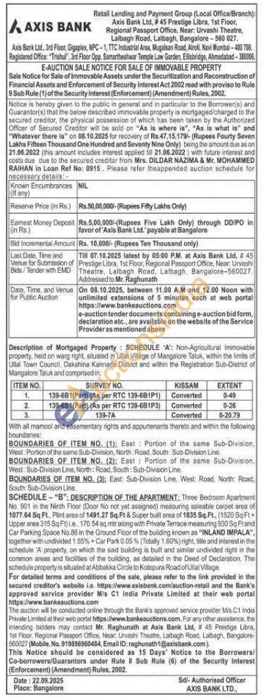 No. 901 in the Ninth Floor (Door No not yet assigned) measuring saleable carpet area of 1077.64 Sq Ft., Plint area of 1491.27 Sq.Ft & Super built area of 1835 Sq.Ft., (1520 Sq Ft Upper area 315 Sq Ft) i.e.. 170.54 sq.mtr along with Private Terrace measuring 930 Sq Ftand Car Parking Space No.86 in the Ground Floor of the building known as "INLAND IMPALA", together with undivided 1.55% + Car Park 0.05% (Totally 1.60%) right, title and interest in the schedule A property, on which the said building is built and similar undivided right in the common areas and facilities of the building, as detailed in the Deed of Declaration. The schedule property is situated at Abbakka Circle to Kotepura Road of Ullal Village