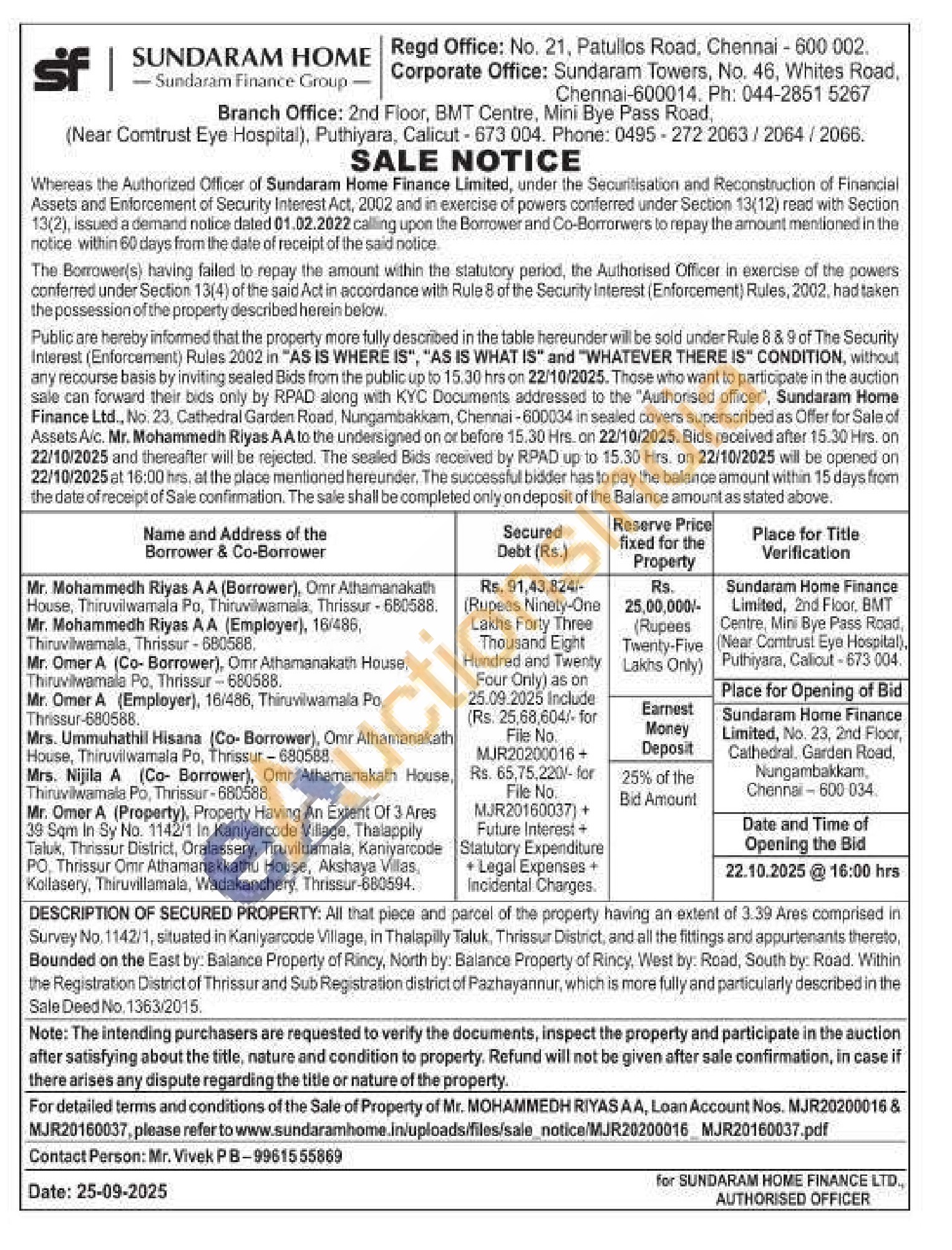 All that piece and parcel of the property having an extent of 3.39 Ares comprised in Survey No. 1142/1, situated in Kaniyarcode Village, in Thalapilly Taluk, Thrissur District, and all the fittings and appurtenants thereto, Bounded on the East by: Balance Property of Rincy, North by: Balance Property of Rincy, West by: Road, South by: Road. Within the Registration District of Thrissur and Sub Registration district of Pazhayannur, which is more fully and particularly described in the Sale Deed No. 1363/2015.