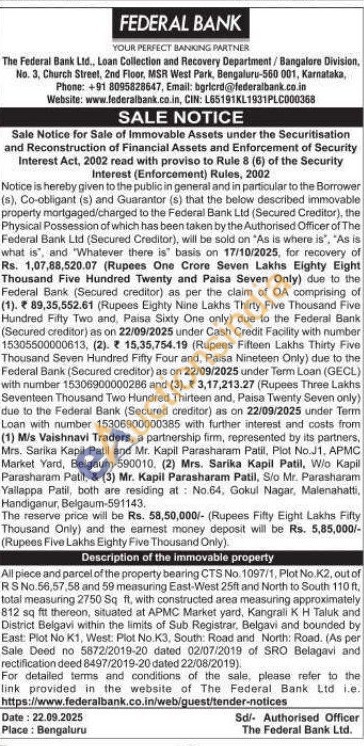 All piece and parcel of the property bearing CTS No. 1097/1, Plot No.K2, out of RS No.56,57,58 and 59 measuring East-West 25ft and North to South 110 ft, total measuring 2750 Sq ft, with constructed area measuring approximately 812 sq ftt thereon, situated at APMC Market yard, Kangrali KH Taluk and District Belgavi within the limits of Sub Registrar, Belgavi and bounded by East: Plot No K1, West: Plot No.K3, South: Road and North: Road. (As per Sale Deed no 5872/2019-20 dated 02/07/2019 of SRO Belagavi and rectification deed 8497/2019-20 dated 22/08/2019).