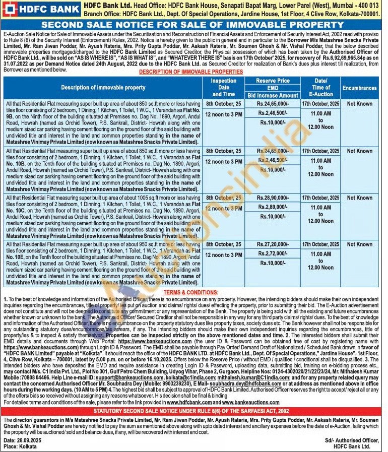 Contact concerned Authorised Officer Mr. Soubhadra Dey (Mobile: 9903239230)