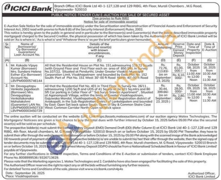 1) All that the Residential House on Plot No. 151.odmeasuring 119.22 Sqyds (with Ground Floor and First Floor each an area of 850 Sft), In Survey No. 107/22, Situated at Pendurthi, Under Greater Visakha Municipal Corporation Limit, Visakhapatnam and bounded by East: Plot No. 152 South: Part of Plot No. 151 West: 30-00 ft Road North: 40-00 ft Road