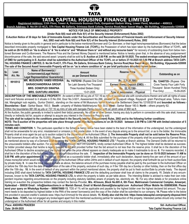 An extent of 881.66 sq yds of 737.16 sq mtrs of residential site with constructions therein and with all rights of ease-ment and fixtures annexed to it situate in D.No.304, Door No.3-50/1, Assessment No.266, situated at Rayapudi village, Rayapudi gram Panchayat area, Tulluru man-dal, Mangalagiri sub registry,, Guntur District,, standing on the name of Mr.Musunuru Vamsi Krishna vide Settlement Deed No. 12105/2016 and bounded as follows:-Boundaries:- East: Sarkar Bazar, 165.0; South: property of Mallela Mallikharjuna Rao 30.0; West: Sarkar Bazar 180.0: North: others property 62: Within the boundaries 881.66 so yds or 737.16 sq.mtrs of site with bangala Penku house, with an plinth area of 960 sq.ft