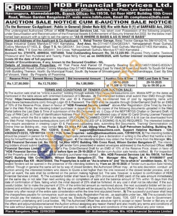Details of Immovable Properties: All That Piece And Parcel Of Property Bearing No #D7/1497/1354/G-833/A/1 Yathagadahalli Road Guthalu Colony Mandya City-571401 Measuring East To West 38 Feet And North To South 64 Feet With Building Thereon, North. By Municipal Road, South. By house of Shivalingaiah and Ramachandrappa, East: By Site of Vincent, West By Property of Poomima.