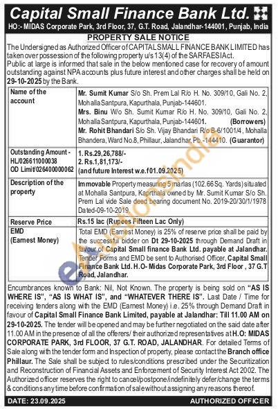 Immovable Property measuring 5 marias (102.66 Sq. Yards) situated at Mohalla Santpura, Kaprthala owned by Mr. Sumit Kumar S/o Sh. Prem Lal vide Sale deed bearing document No. 2019-20/30/1/1978 Dated-09-10-2019.