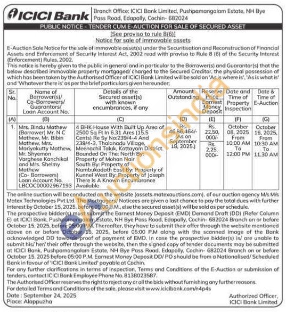 4 BHK House With Built Up Area of 2500 Sq Ft in 6.31 Ares (15.5 Cents) Re Sy No:239/4-4 And 239/4-3, Thalanadu Village. Meenachil Taluk, Kottayam District. Bounded On The: North By: Property of Mohan Nair South By: Property of Nambukadath East By: Property of Kunnel West By: Property of Joseph There Is A Known Encumbrance Available