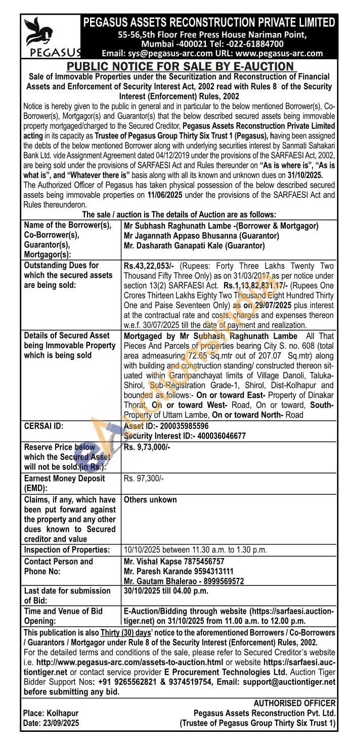 Mortgaged by Mr Subhash Raghunath Lambe All That Pieces And Parcels of properties bearing City S. no. 608 (total area admeasuring 72.65 Sq.mtr out of 207.07 Sq.mtr) along with building and construction standing/ constructed thereon sit-uated within Grampanchayat limits of Village Danoli, Taluka-Shirol, Sub-Registration Grade-1, Shirol, Dist-Kolhapur and bounded as follows:- On or toward East- Property of Dinakar Thorat, On or toward West Road, On or toward, South-Property of Uttam Lambe, On or toward North- Road