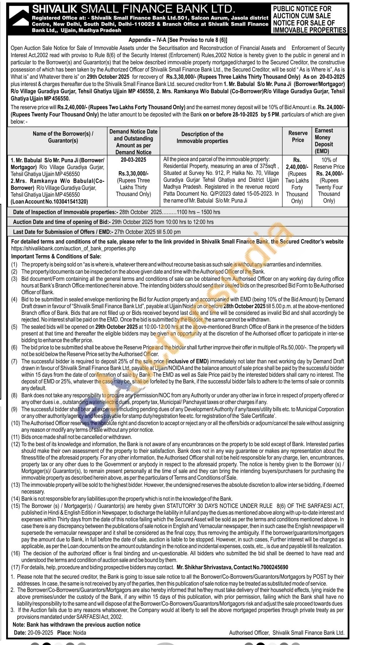 All the piece and parcel of the immovable property. Rasicential Property, measuring an an area of 375soft Situated at Survey No. 912, P. Halka No. 70, Vilage Guradiya Gujar Tehsil Ghatiya and District Ujjain Madhya Pracesh. Registered in the revenue record Palta Document No. Q/P/2023 dated 15-05-2023. In the name of Mr. Batual Slo Mr. Puna Ji