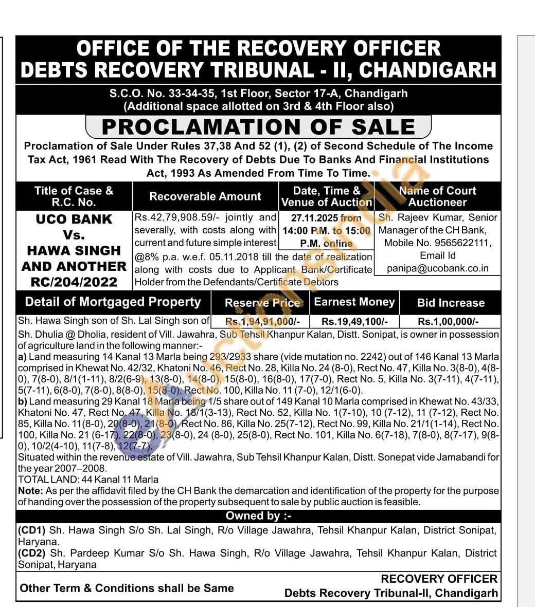 Sh. Hawa Singh son of Sh. Lal Singh son of Sh. Dhulia @ Dholia, resident of Vill. Jawahra, Sub Tehsil Khanpur Kalan, Distt. Sonipat, is owner in possession of agriculture land in the following manner:- a) Land measuring 14 Kanal 13 Marla being 293/2933 share (vide mutation no. 2242) out of 146 Kanal 13 Marla comprised in Khewat No. 42/32, Khatoni No. 46, Rect No. 28, Killa No. 24 (8-0), Rect No. 47, Killa No. 3(8-0), 4(8-0), 7(8-0), 8/1(1-11), 8/2(6-9), 13(8-0), 14(8-0), 15(8-0), 16(8-0), 17(7-0), Rect No. 5, Killa No. 3(7-11), 4(7-11), 5(7-11), 6(8-0), 7(8-0), 8(8-0), 15(8-0), Rect No. 100, Killa No. 11 (7-0), 12/1(6-0). b) Land measuring 29 Kanal 18 Marla being 1/5 share out of 149 Kanal 10 Marla comprised in Khewat No. 43/33, Khatoni No. 47, Rect No. 47, Killa No. 18/1(3-13), Rect No. 52, Killa No. 1(7-10), 10 (7-12), 11 (7-12), Rect No. 85, Killa No. 11(8-0), 20(8-0), 21(8-0), Rect No. 86, Killa No. 25(7-12), Rect No. 99, Killa No. 21/1(1-14), Rect No. 100, Killa No. 21 (6-17), 22(8-0), 23(8-0), 24 (8-0), 25(8-0), Rect No. 101, Killa No. 6(7-18), 7(8-0), 8(7-17), 9(8-0), 10/2(4-10), 11(7-8), 12(7-7). Situated within the revenue estate of Vill. Jawahra, Sub Tehsil Khanpur Kalan, Distt. Sonepat vide Jamabandi for the year 2007-2008. TOTAL LAND: 44 Kanal 11 Marla Note: As per the affidavit filed by the CH Bank the demarcation and identification of the property for the purpose of handing over the possession of the property subsequent to sale by public auction is feasible.